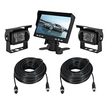 FEATURES: - Professionally designed system with industrial leading components/parts.- CCD camera with 2.1mm wideangle lens. This offers a super wide field of view angle at 120°. Most other manufacturers use 3.6mm or 2.8mm lens, the view angle is much narrower. You can see more areas by using 2.1mm lens- Builtin 18 IR LEDs for over 20ft nightvision view.- Heavyduty 20M (66ft) video + power cable with a waterproof aerospacetype connector.- Waterproof camera body with a sunvisor and metal bracket. Easy to mount on any flat surface of the vehicle- Rubber seat for video cable to go through inside the cabinet without scratching the surface.- 12V 24V DC power input range to fit most of the medium to large vehicles on the road- Allinone design to get rid of the bulky converter power box, very easy to setup.- The TFT SCREEN has the switches to change between normal to mirrored image of the 2 cameras.- Camera selection is done via remote controller or by pressing button on the monitor.- Rear view camera is turned on automatically when vehicle is put on reverse gear.- The most advanced part is that the 2 cameras can switch on in turn automatically depending on the status of your vehicle, like opening the door.- Aerospacetype cinch connectors are used for all connections. This is more reliable and simple to install.- Lightweight 16:9 wideangle view 7" TFT LCD color monitor with remote controller. Special heatventilation design for longer life of use. 7" LCD Monitor Specifications: - Color TFT LCD- 7" Brand New Panel- 800 x 480 pixels- Screen Ration 16:9- Aerospacetype AV inputs- Power voltage range at DC 24V- Power Consumption : Max 6W- Allinone power cable- Display reverse function- Operating Temp :14° F ~ 158° F.